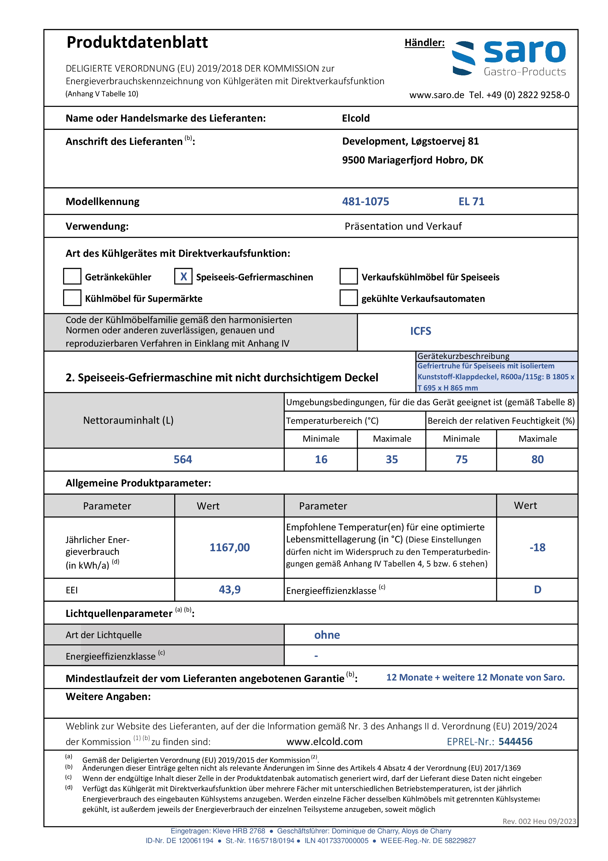 Congélateur coffre SARO pour crème glacée/modèle EL 71